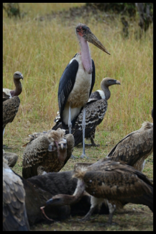 There was some small bird life but the bigger birds made more of an impact. Below are a blue heron, a lilac-breasted roller and a secretary bird followed by a female ostrich. Then you’ll find a set of vultures devouring a wildebeest overseen by a maribu stork in the manner of a teacher on playground duty I felt! The latter photos are not for the fainthearted and the smell was unspeakably pungent!