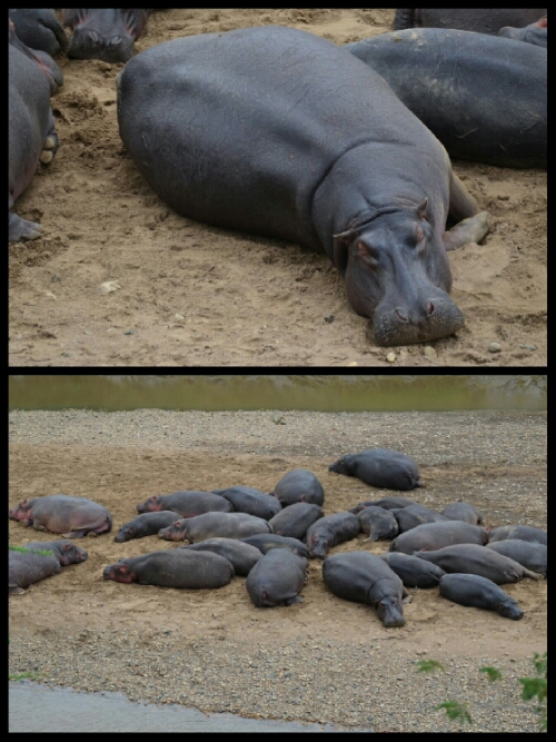 Finally here are a few other sightings: a warthog, a buffalo, a crocodile, a troupe of baboons and some distant sleeping hippos.