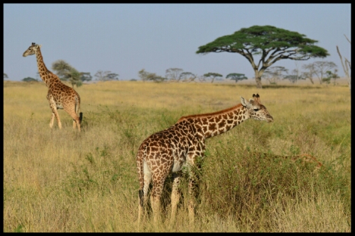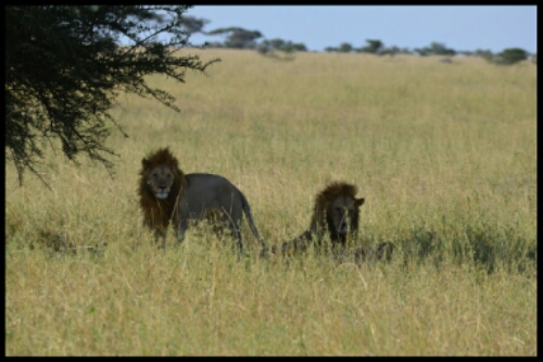 The further we travelled, the less the grasslands had been burnt. As we were beginning to wonder whether this was all the Serengeti had to offer, a vibrant patch of tall grass came into view, fed by a small steam. Then walking just ahead of us we saw a pair of adolescent male lions, crossing over the road to reach the stream! All the lions we’d seen in Kenya had been snoozing drowsily under trees or had been far away so seeing these on the move and pretty close was amazing.