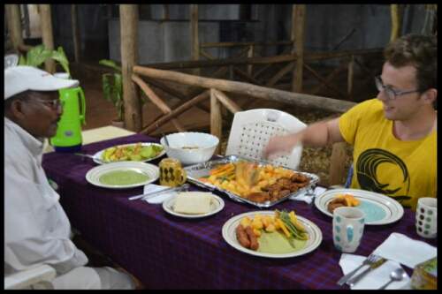 That evening we stayed at a nice campsite called Haven Nature and met smiley Raju who was to travel with us as our cook for the next five days. He welcomed us with a bowl of popcorn and for the rest of the trip continually wowed us with impossibly fresh, delicious culinary masterpieces whipped up in temporary kitchens from just one box of ingredients. Every evening meal began with amazing soup and ended with fresh fruit. In between were pasta dishes, steak, salads, local curries, vegetable dishes… Breakfasts consisted of fruit, pancakes, eggs and toast and he provided us with a packed lunch most days too. Maybe he was a magician. It was certainly all much better than we expected!