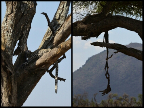 Another equally lazy leopard (here they sensibly pronounce it like we say leotard!). Although we didn’t see any active leopards, we did see the gruesome remains of one of their wildebeest meals: they drag their food up a tree to eat it away from any hyenas waiting below.