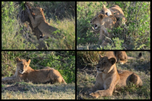 The pride of lions we’d spent time with yesterday had moved a little and were lying, almost camouflaged, in the distant grass. An adult female crossed our path and headed over to them to tell them of a catch. Immediately the cubs leapt up and bounded towards us, veering around us to their left and then disappearing down a grassy bank in an excited cloud of dust! The adults followed at a much more sedate pace.