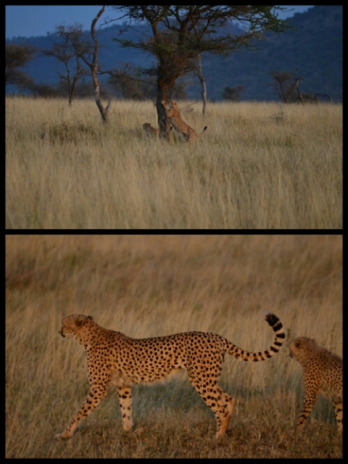 Having seen everything we wanted to see, we’d begun to be a bit more specific about our wishlist! Top of Dean’s was a cheetah with cubs. By about 6:45am, we’d seen some! We tracked them through binoculars for quite a while. Unbeknownst to them, two lions were in the vicinity but we don’t think they caught up with the playful cubs.