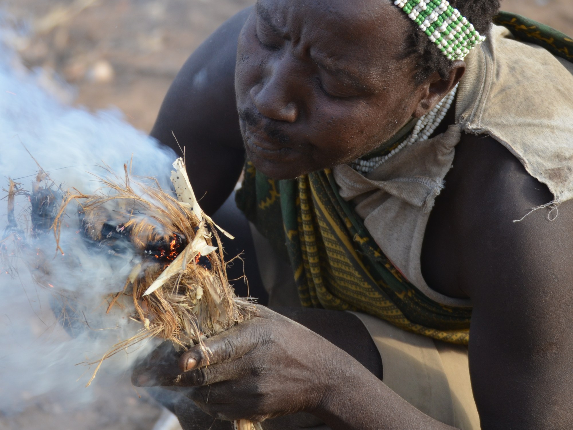 Here men and women remain segregated for most of the day so next we were led slightly uphill to an over-hanging rock to find the hunters. Under it sat five men around a fire, dressed in worn out shorts paired with animal skins – mainly baboon and dik-dik. They didn’t get up from their rock perches but instead raised their hands to shake ours. They too were looking bleary-eyed but it emerged that this was probably more attributable to their daily marijuana breakfast than the earliness of our visit.