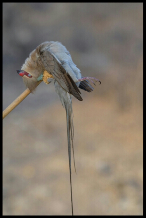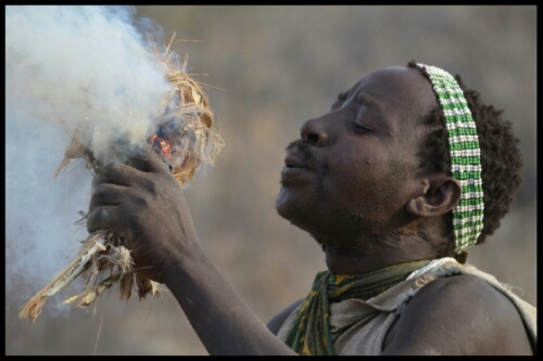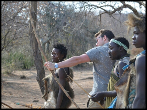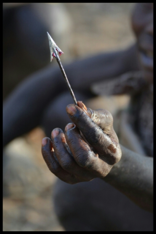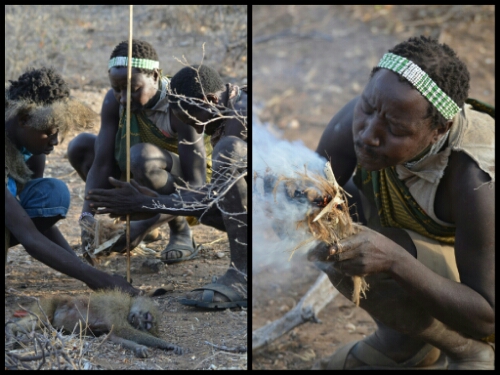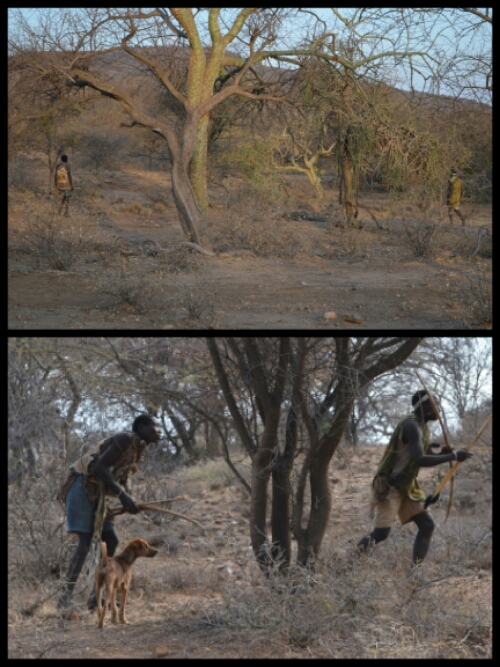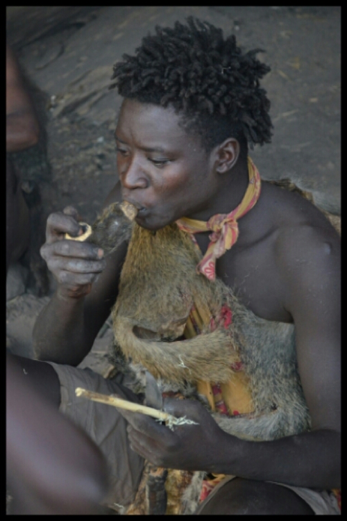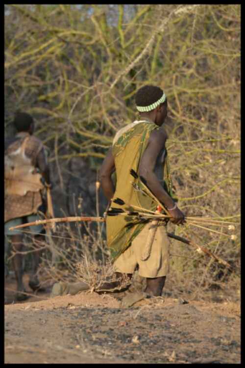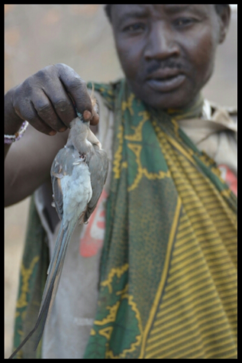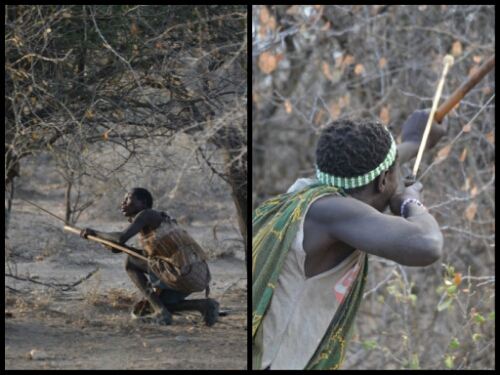 After about half an hour and a few almosts, one of the Hadzabe men crouched, aimed, shot and killed a small bird which he showed us then stowed away in a pouch in the folds of his clothing.