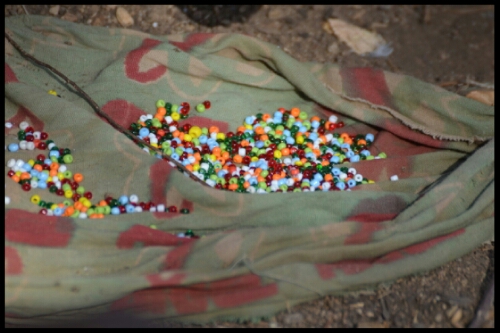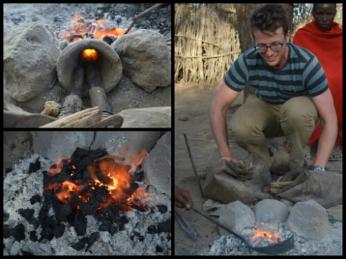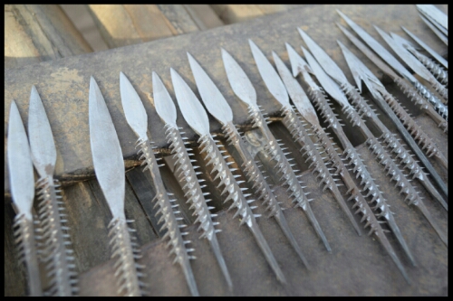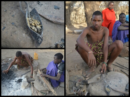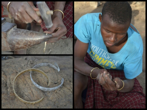 Leaving the hut, we were led to another open area where we met some of the family’s young men, engaged in their traditional industry of metalwork. They were seated on the ground around a pile of charcoal and one was shaping a piece of metal into a bracelet. Nearby was a display of their handiwork: arrowheads for their community and jewellery for tourists!
