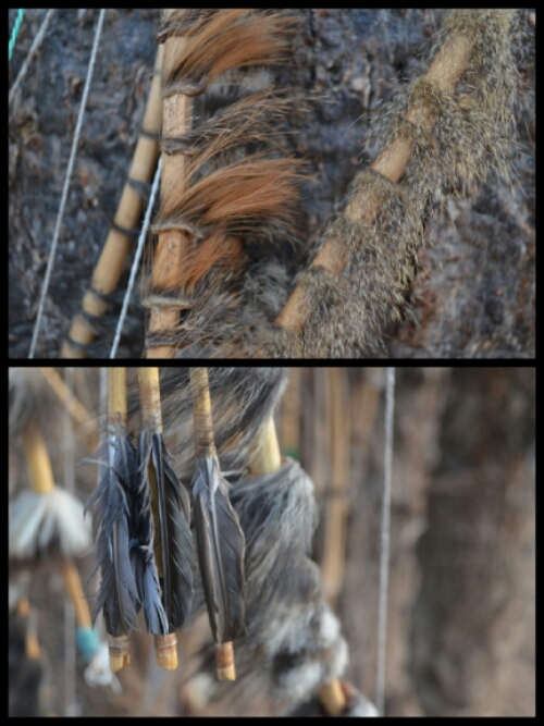 Julius then told us about bows and arrows. The bows, decorated with tufts of fur, are wooden with string made of some kind of animal leg sinew or plant. All the arrow shafts are made of wood but then there are three kinds of tip. One is metal and is covered in poison made from plant extracts. When dry, the poison is harmless, but once it comes into contact with its target’s bloodstream, it is activated. These arrows are used on larger animals who then take some time to die and are consequently re-traced by the hunters on the next hunt. These animals must then be cooked in order to make them safe to eat. The second type of arrows are metal with no poison, for smaller animals and the third kind are made of wood, sometimes with pieces of corn on the cob on the end which somehow helps with catching birds! On the ends of each arrow are feathers from birds such as guinea fowl and eagle.