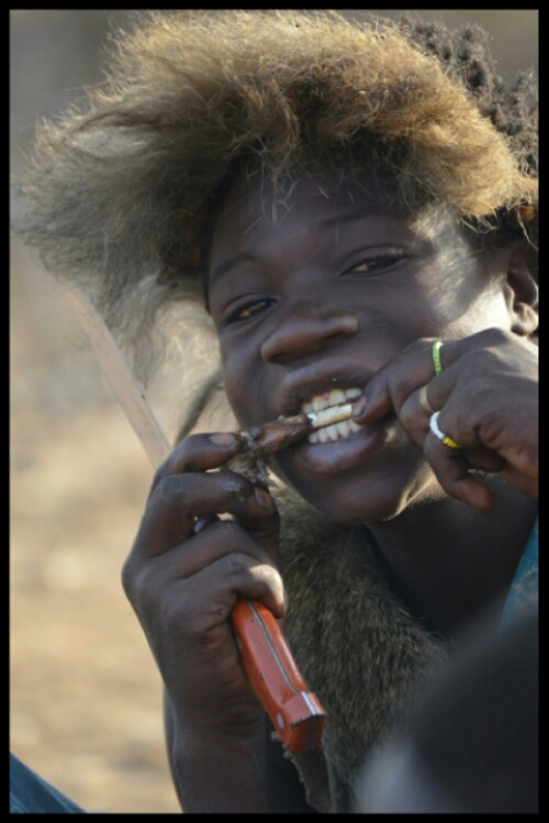 It turned out that the baboon – a favourite meat due to its saltiness – had been the victim of an arrow during the previous evening’s hunt. The teenager and his dog had followed the baboon’s tracks to locate and retrieve it for the tribe. Traditionally the hunters are entitled to the innards so before we really knew what was happening, it became apparent that it was breakfast time!