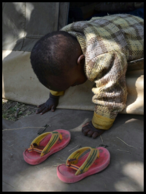 Once they’d erected our tent under the shade of a large tree, we received a visitor: Glory. Too small to step over the doorway, she plunged in, head first and enjoyed wandering around over our sleeping mats.