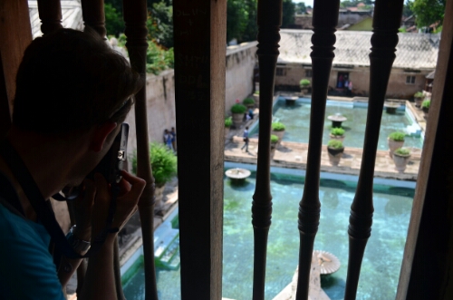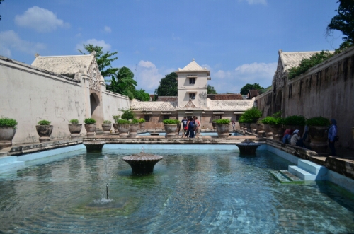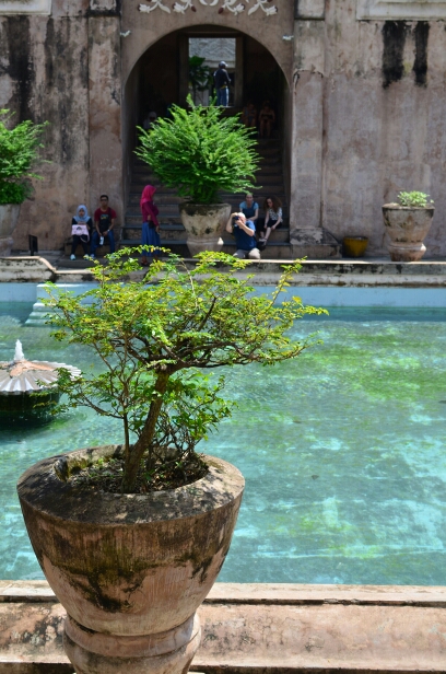 After the kraton, we wound our way through some of the walled city’s quieter streets where the constant buzz of the traffic was replaced by the tweeting of the caged songbirds, hung outside more or less every house. The bottles of motorbike fuel for sale on the roadside were exchanged for rice drying on the ground. And almost everyone you pass has a smile and a greeting to share. The Javanese are so friendly! Next we visited the sultan’s (no longer used) pleasure palace: a series of pools and waterways he would have once enjoyed with his wives. It was very difficult to restrain ourselves from jumping straight in!