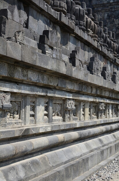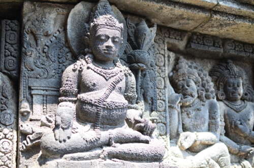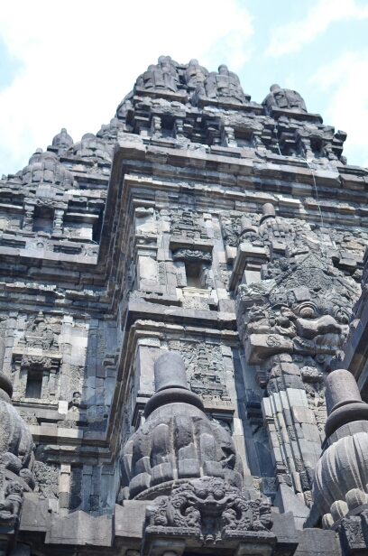 Although today Indonesia is a predominantly Muslim country, our next two days’ excursions were to a hugeHindu temple complex – Prambanan – and an enormous Buddhist temple – Borobudur. Both, strangely, were built in 9th century at a time when Buddhism was giving way to Hinduism suggesting there was some level of understanding and cooperation between the two religions. A couple of centuries later, both had been more or less abandoned as the population converted to Islam. The same dark grey stone from nearby rivers and similar building methods were used for each – interlocking the stones rather than using mortar.