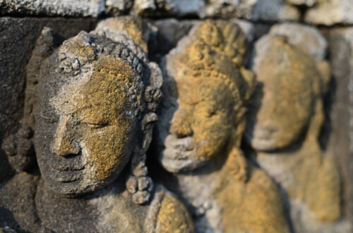 It’s said that for Buddhists the temple is representative of their path to enlightenment. Pilgrims walk from a temple about 3km away, stop at another half way and finally reach Borobudur. They then walk around each level from the base to the top. The base represents Kamadhatu, the world of desires.Rupadhatu, the world of forms is the next five platforms where a being no longer has desires. The final three levels and the stupa at the top represent the formless world – Arupadhata where full buddhas experience nirvana.
