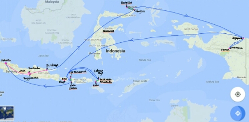 It’s a fairly complicated adventure this year, with 13 flights and 16 different accommodations during the 30 day visa. The archipelago of Indonesia consists of around 17,000 islands and so we’ll only skim the surface of what the country has to offer but hopefully we’ve planned for a good variety of experiences. Here is the trip in map form: