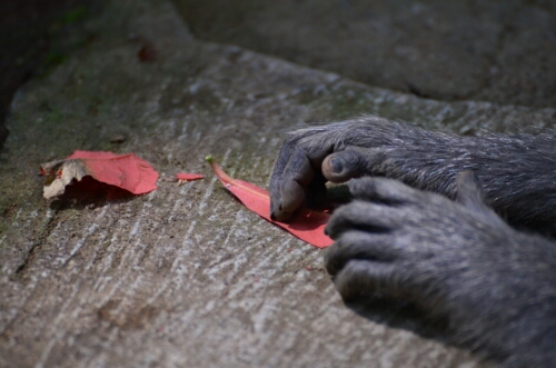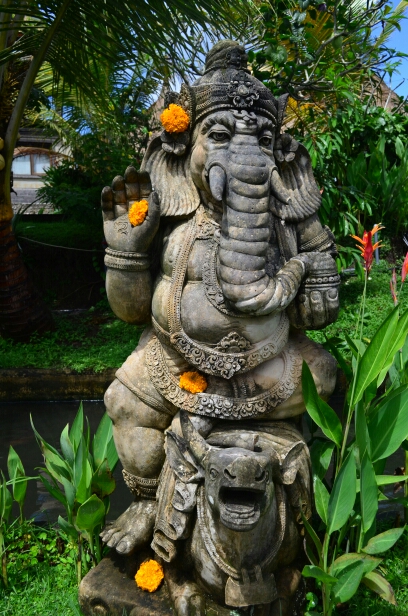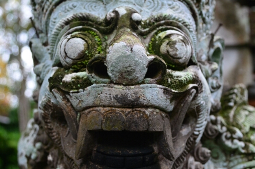 Since we knew we’d be finishing our holiday at the beach, we opted for the inland town of Ubud on the island of Bali. It was so busy! We’d planned to cycle through rice paddies but the weather was unexpectedly, unseasonably bad (August’s total rainfall is usually 5mm but is so far 101mm this year: we’d had a lot of that in our first couple of hours there!). It’s an unusual place because the streets are lined with surfer brand clothes shops, hotels and hostels, souvenir stalls, modern cafes and restaurants, yet woven between, above, inside and around all that are very traditional temples, statues, doorways and buildings. All are carved from stone or wood in ornate designs and often vivid pink, orange, yellow and white flowers decorate them. Only a few photos due to the rain. The open-mouthed being is a much-used motif!