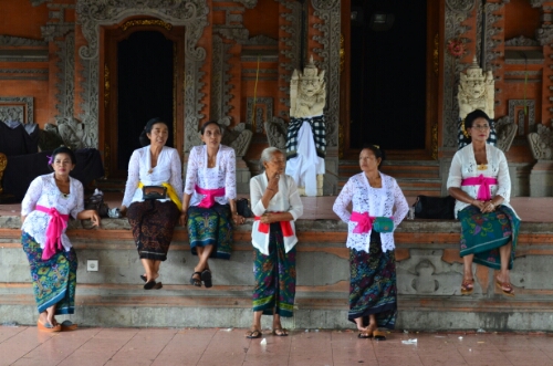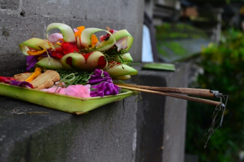Outside every business lies offerings to the deities and demons of Balinese Hinduism. Even outside the Quiksilver shop. Even outside our room. Folded banana leaves form the outside and then inside there’ll be flowers, rice and sometimes biscuits or sweets. When laid out, water is flicked over the offering and, on those which are more out of harm’s way, incense sticks are added.