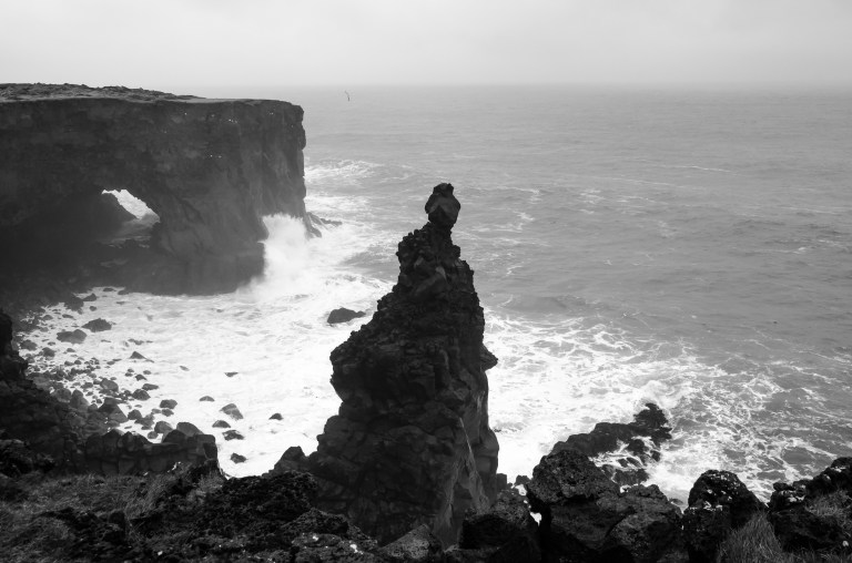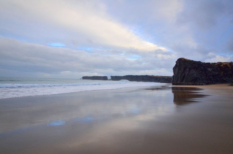 The black sand and pebble beach at Reynisfjara featured an impressive cave and hexagonal basalt pillars like those on Northern Ireland’s Giant’s Causeway. There were also looming basalt sea stacks just off shore.
