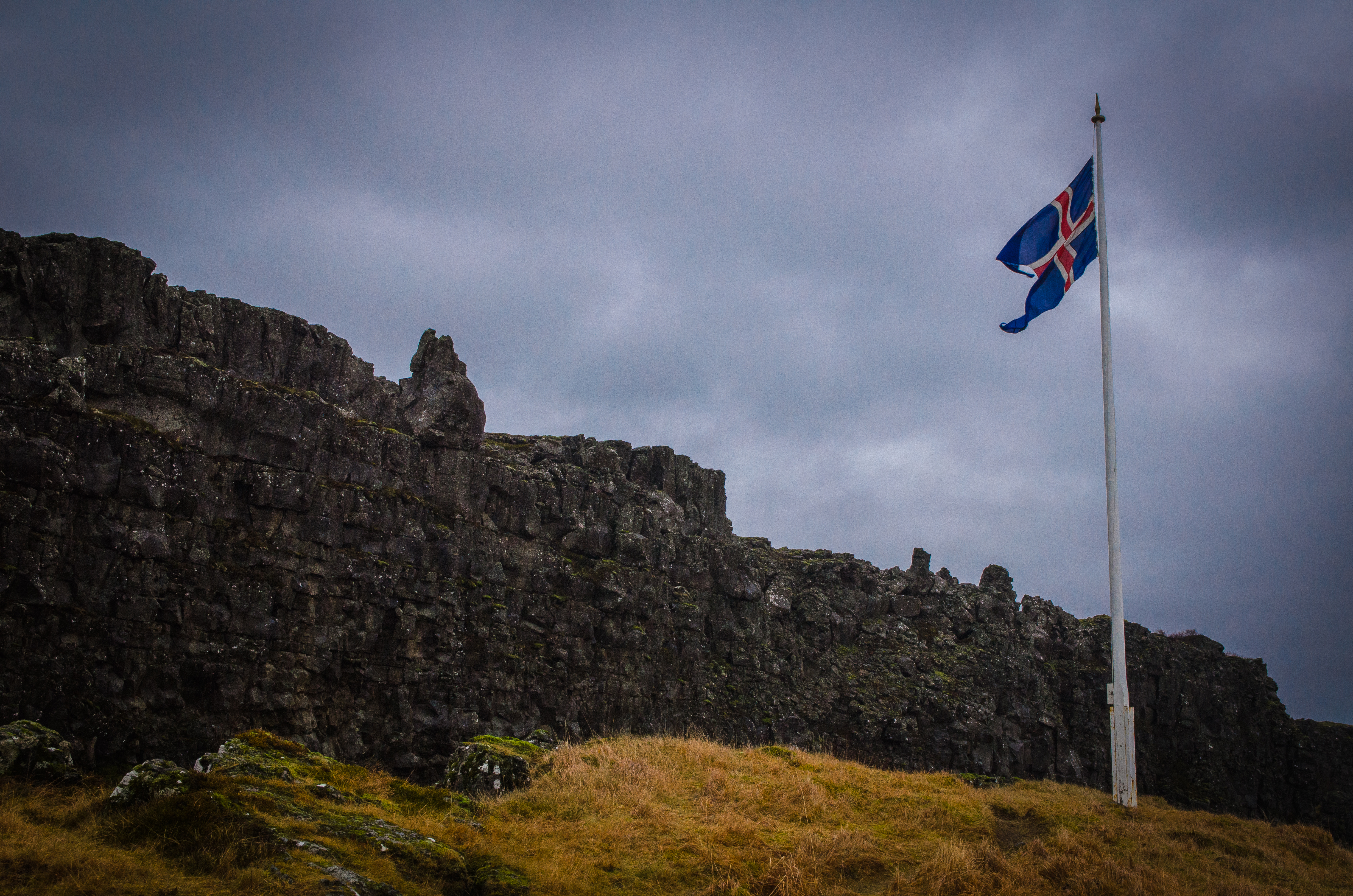 Since the original Viking settlers were self-governed, local chieftains (gođar) ran district assemblies (þings) where disputes could be resolved and justice administered. Individuals would then be responsible for enforcement, and often vengeance! Eventually the society began annual fortnight-long nationwide assemblies at this site which continued for over 300 years. A third of the country’s laws were delivered from memory by the law-speaker each year as there was no written language at this point. Crowds of thousands gathered on the plains around the law rock (Lögberg – possibly at the place now marked with a flag) to witness the law council pass laws, make decisions, confirm the calendar, form marriage contracts, and hand down judgments, all with the amplifying backdrop of the tectonic plate rock face.