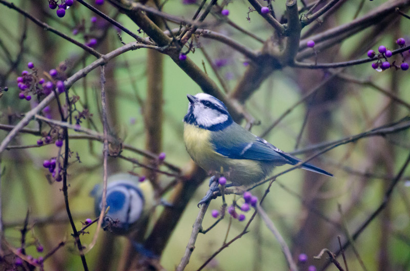 Next up are the tits. We have four species – blue, great, long-tailed and coal – but I only have photos of the first three. Here are the blue tits. Many of the photos, of these and of other small birds, are taken in our photogenic corkscrew hazel. The first photo on the slideshow – hands-down my favourite – was taken by Dean and shows blue tits in next door’s beautiful purple callicarpa bush.