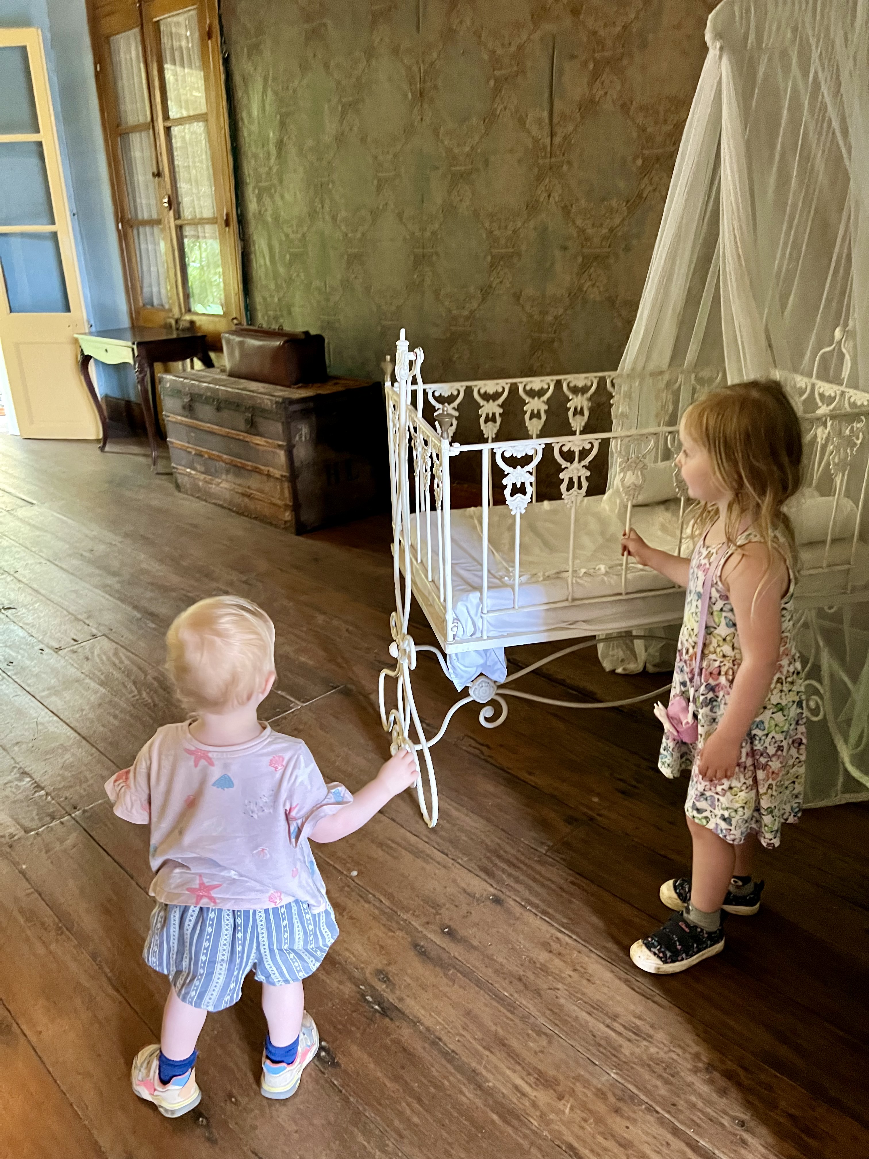 The girls LOVED it! Running unhindered throughout the airy rooms, in and out of the doors, deciding who’s bed was who’s. And Small was particularly taken by the old-fashioned bathroom!
