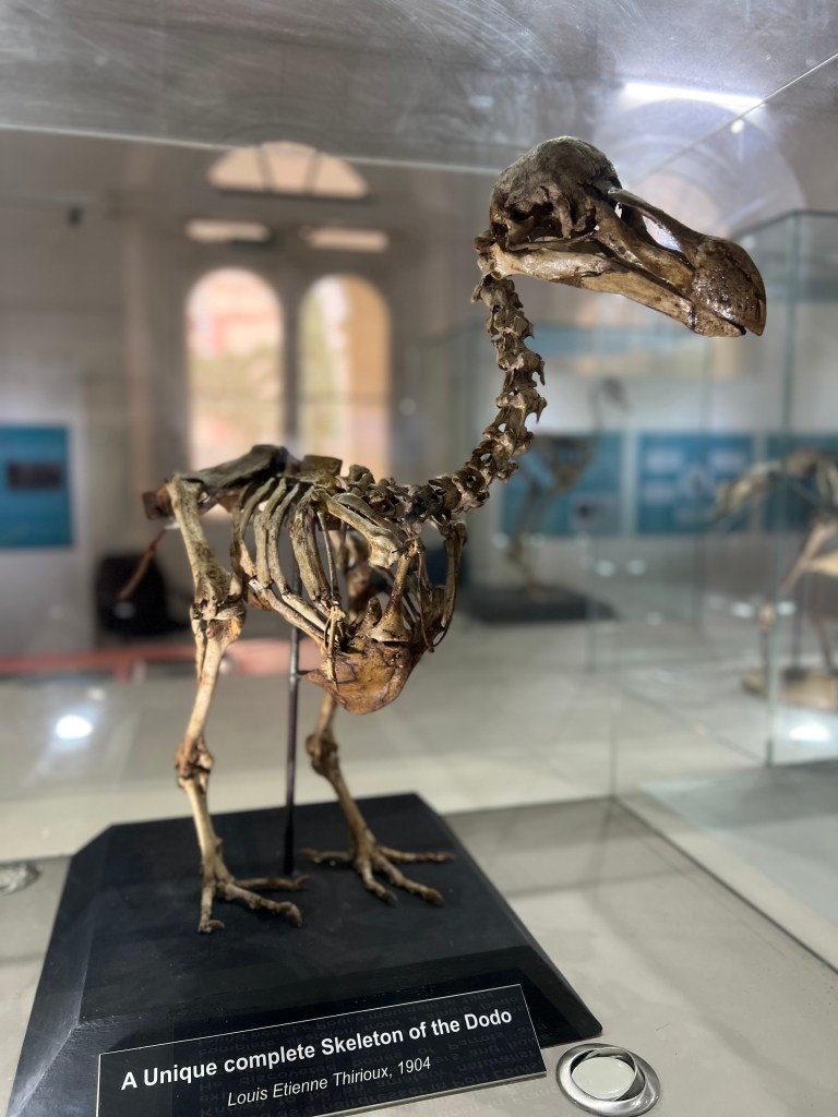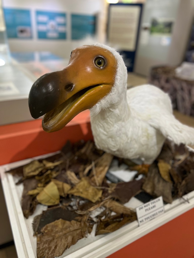 The main reason we came, however, was to see the dodo skeleton. It’s the only near-complete one ever found. Most others are compilations of various different birds. It was pretty cool to see and gave Indy a specific focus for the visit. Discovered in 1904 by a barber named Etienne Thirioux, it’s such an icon of Mauritius so we were glad to learn more about it!