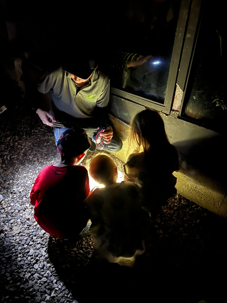 We joined an evening tour which meant it was a little more crowded but, of course, we saw more and the frogs were generally more active too. Everyone’s given a torch which adds an extra level of fun for the kids too. We also saw glow-in-the-dark scorpions under the guide’s UV torch! There’s also a natural history room full of insect and other specimens you can spend a bit of time in.