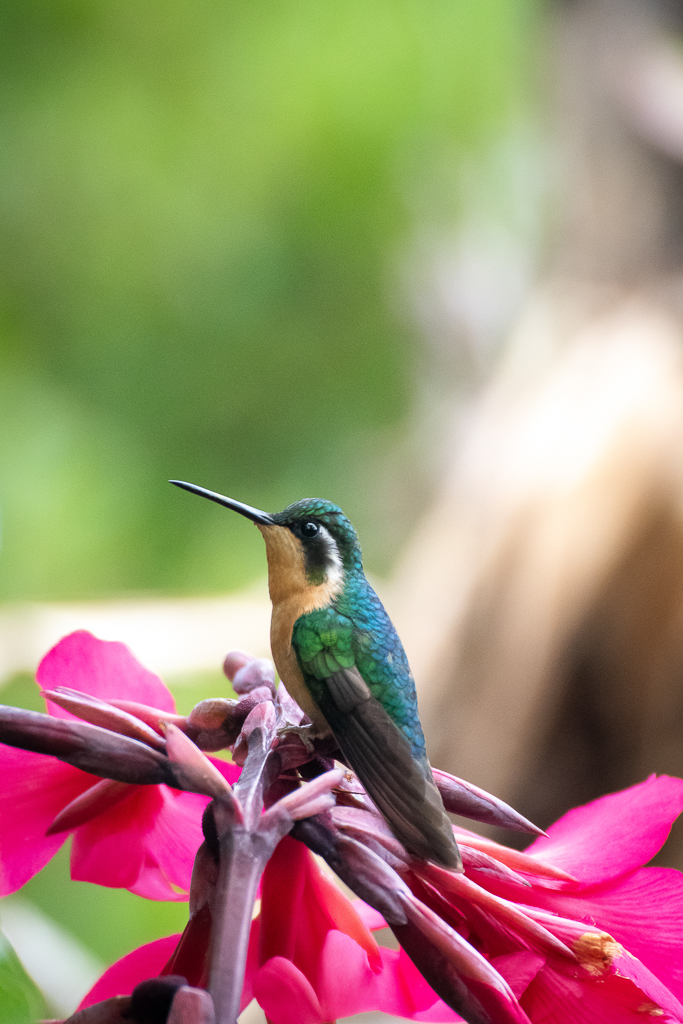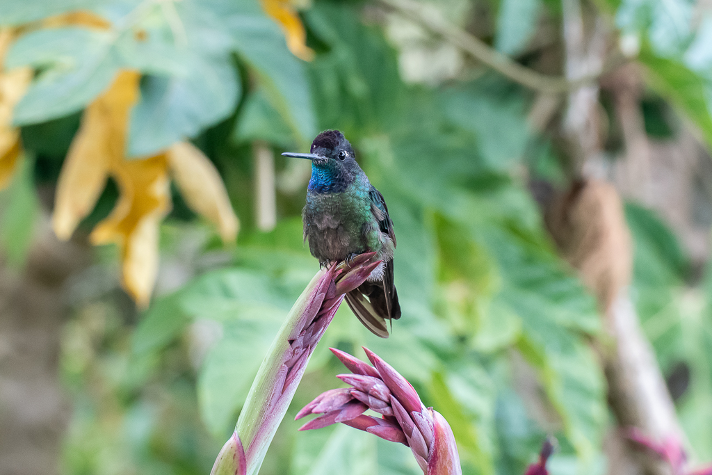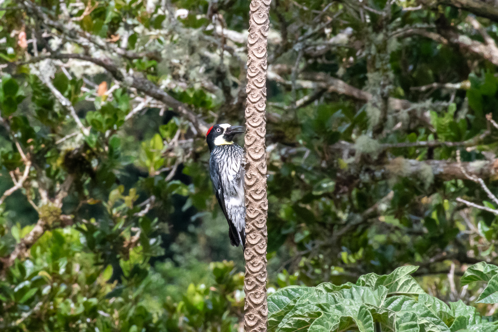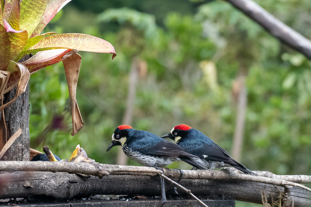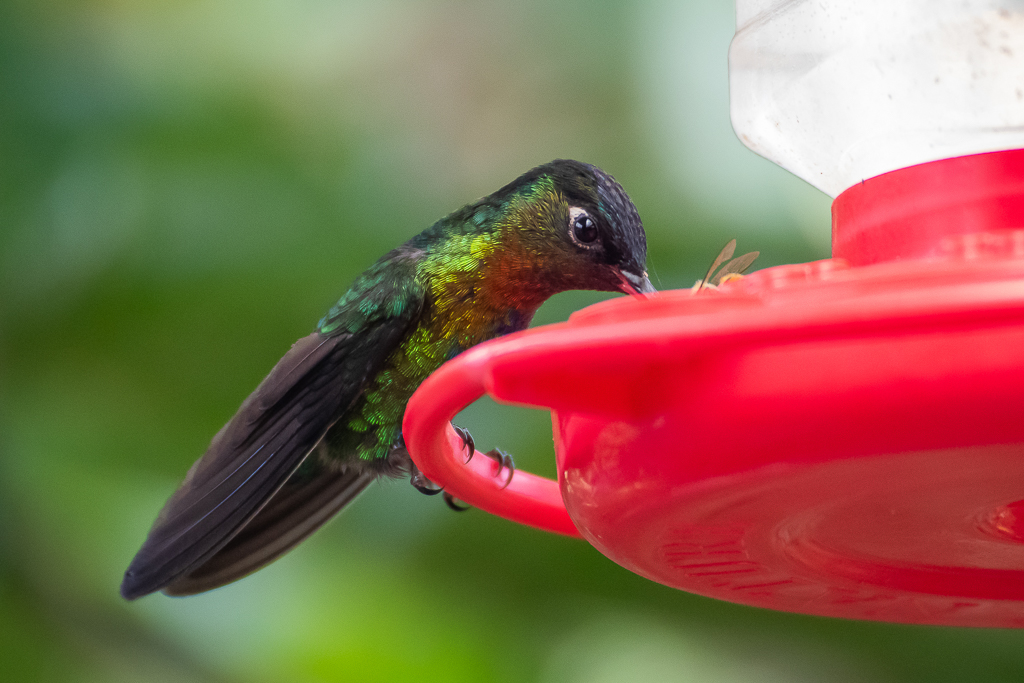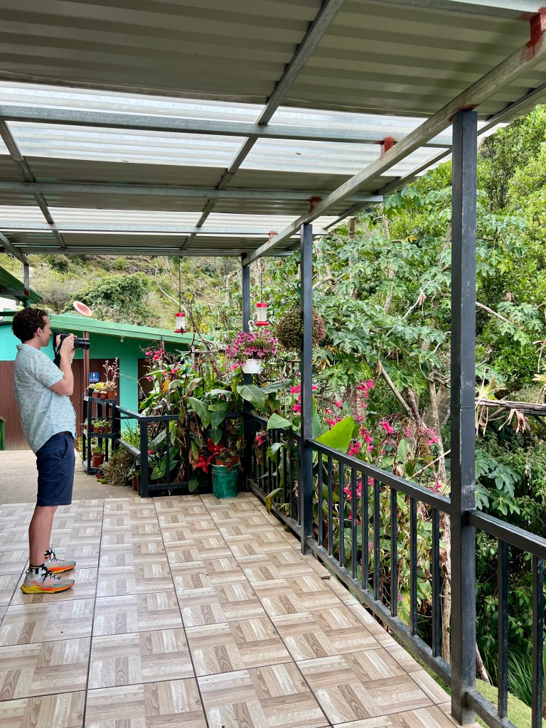 Descending into the San Gerardo de Dota Valley, we pulled in at the unassuming Miriam’s Quetzals. Climbing out of the car, stretching after a long stint on the road, we weren’t sure what to expect as we headed through the bright and airy café and out onto the back veranda. But we were met with such a magical sight! Tall aguacatillo trees, colourful flowers, feeding stations and a full rainbow of exotic birds! Naturally we watched and photographed for ages. Here’s a little gallery including flame-coloured tanagers (yellows are female and oranges are males), acorn woodpeckers, a blue-grey tanager and, of course, plenty of hummingbirds.